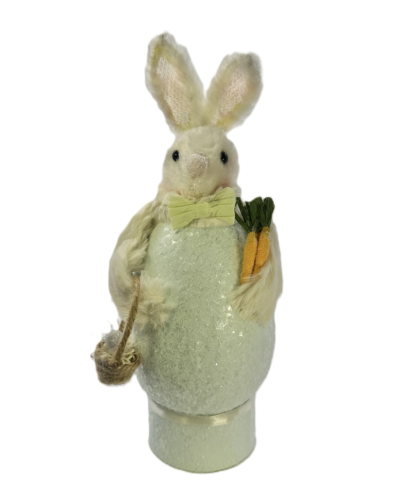 Meet our Roly Poly Rabbit: sky-blue, round, and absolutely feeling himself. Dusted head-to-toe in shimmering glass glitter, he sports plush faux-fur arms—one clutching a sparkly carrot, the other a basket ready for springtime spoils. A celery-green bow ties the look together (literally), while perky ears and a soft pink nose seal the charm. He stands proudly on a round disk base wrapped in satin ribbon, spreading cheer like it’s his day job.