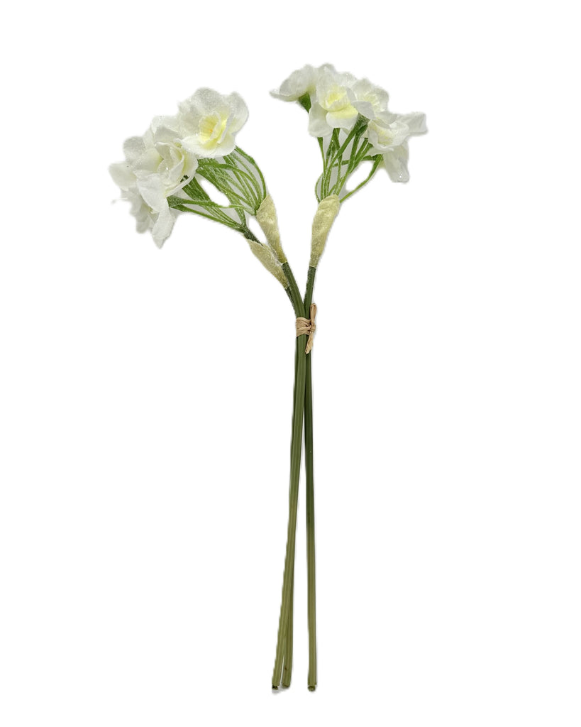 Our white daffodil stems are lavishly adorned with a shimmering coat of light-reflecting glass glitter, adding radiant elegance to any setting. These stems are stunning on their own, in a lush bouquet, or paired with our other botanicals to create a captivating and versatile arrangement. Perfect for brightening up a centerpiece, enhancing seasonal décor, or bringing a touch of sparkle to everyday floral displays.