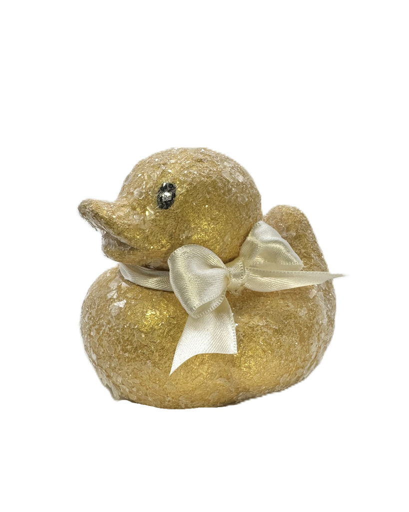 Meet the ducky who understood the assignment. Gold and drizzled in sparkling glass glitter, it's finished with a pretty ivory-colored satin ribbon bow choker for just the right amount of flair. Poised to waddle—er, float—straight into your Easter festivities and steal a few smiles along the way.
