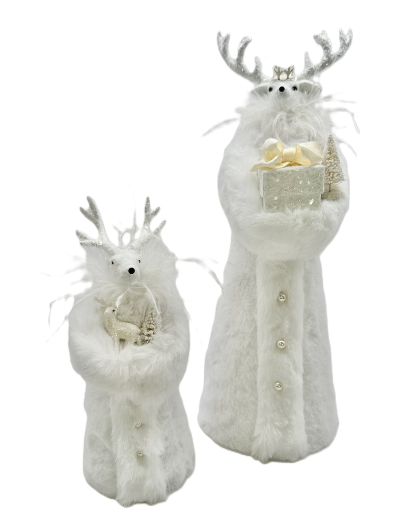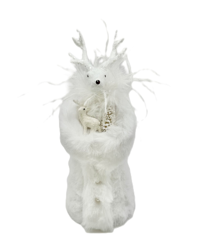 He steals the spotlight in a full-length white faux fur frock finished with pearl buttons, like something straight out of a lavish winter soirée. An airy ostrich feather boa adds a playful flourish, dialing up the drama in the best way. In hand: a tiny shimmering fawn and flocked sisal tree.
