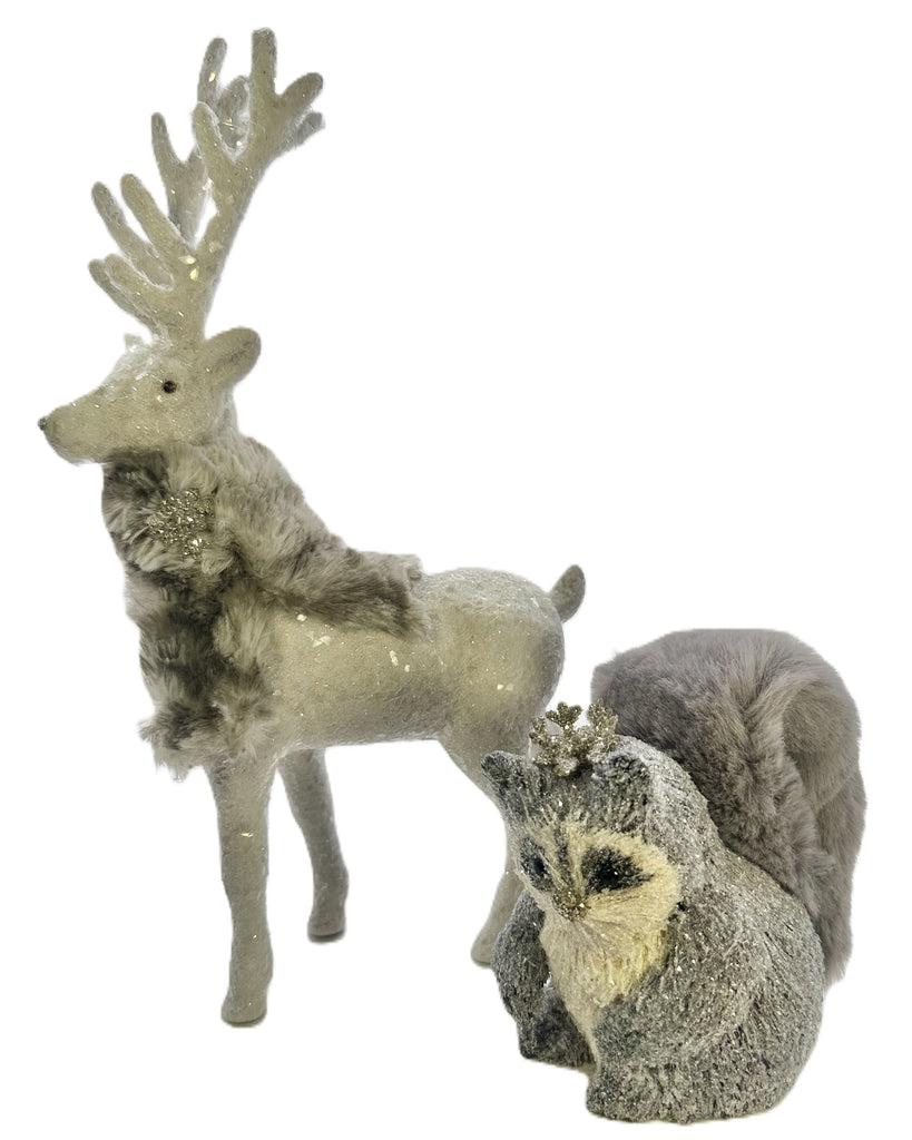Prancer isn’t just dashing through the snow—he’s stealing the spotlight. This dove-colored darling glows head-to-hoof in glass glitter, topped with a black rhinestone nose that practically purrs, “Rudolph who?” Finished with a plush mink faux-fur scarf, he delivers woodland chic with just the right dose of holiday swagger.