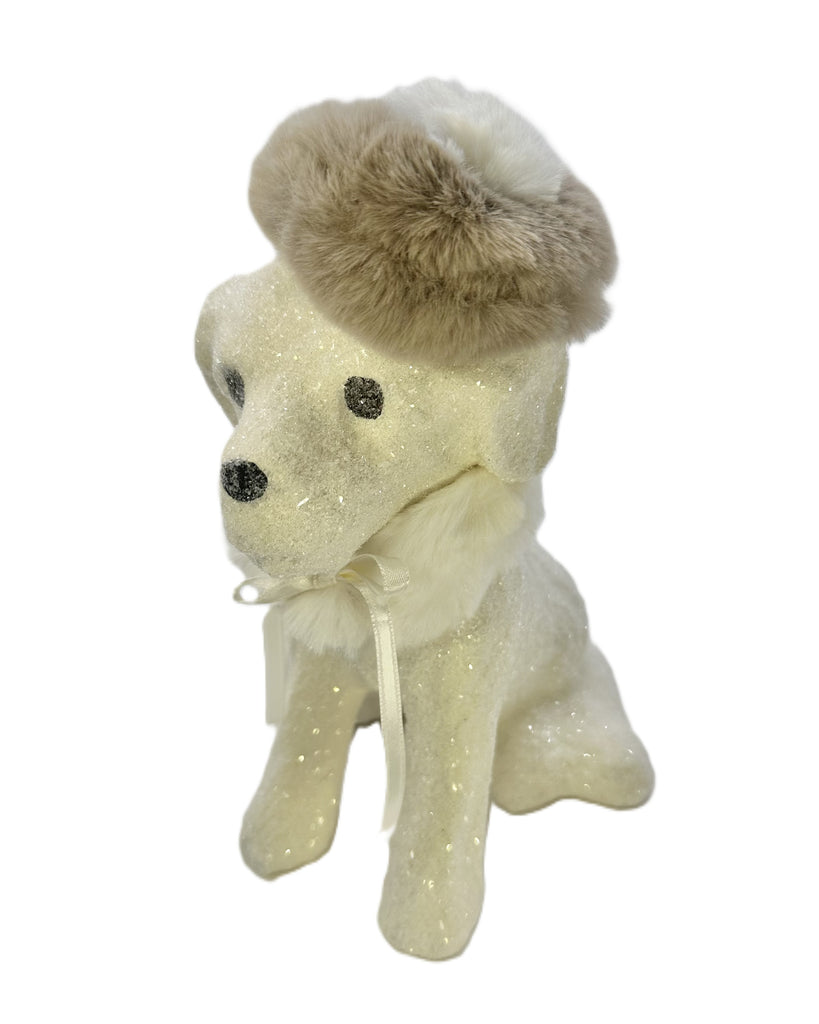 Meet Spike, the most dashing dog of the holiday season! With a taupe-colored faux fur beret and a sumptuous ribbon choker, this posh pup is all about winter chic. Spike’s glistening cream-colored face and body, adorned with sparkling glass glitter, ensure he’s always the star of any festive display. Whether he’s guarding the tree or cozying up on your mantel, this canine charmer adds a touch of glamour to your holiday décor.