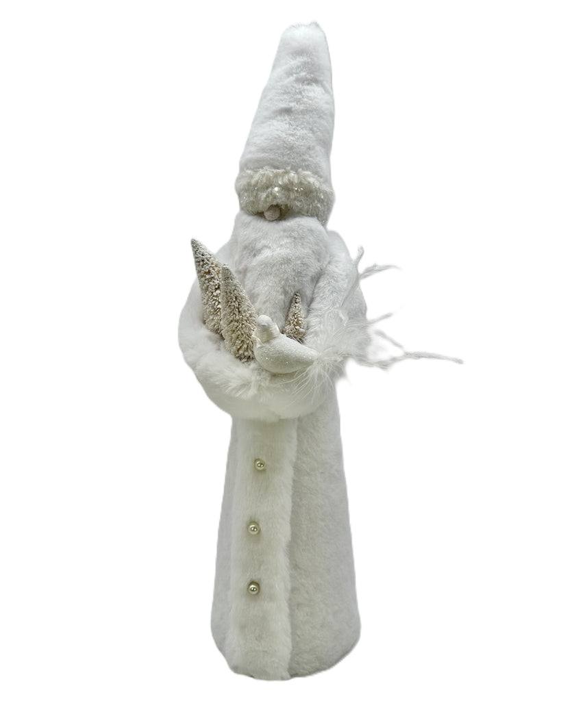 Our Jingle Santa is a holiday heartthrob. That rosy little nose? Pure peppermint energy. The glittered partridge with a wispy feather tail and snowy, flocked trees are giving storybook charm, like he just stepped out of a vintage carol. That pointy white faux fur hat tops things off perfectly, and the pearl-buttoned, full-length coat? Regal, refined, and ready to rule the mantel. Santa didn’t come to play—he came to sleigh.