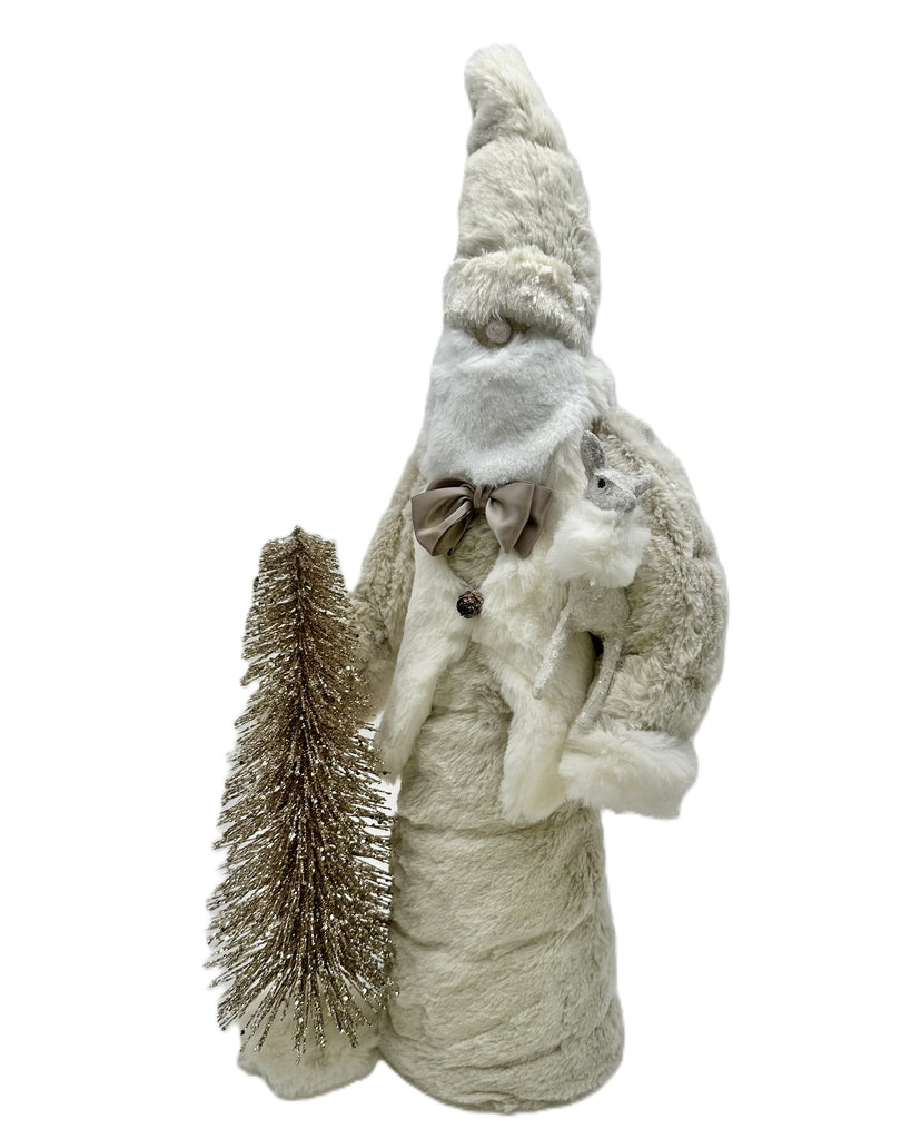 Meet Mr. Claus—Santa with serious star power. This merry maestro isn’t just spreading cheer; he is the cheer. Twinkling eyes peek from behind a snowy, billowy beard, and a plush channeled faux-fur coat and ivory vest—with a dainty pinecone button and a floppy satin bow—make him holiday-ready. In one hand, he cradles a wide-eyed fawn; in the other, a golden tree poised to deck your halls. Larger than life and brimming with charm, he’s the festive hero your mantel has been dreaming of.