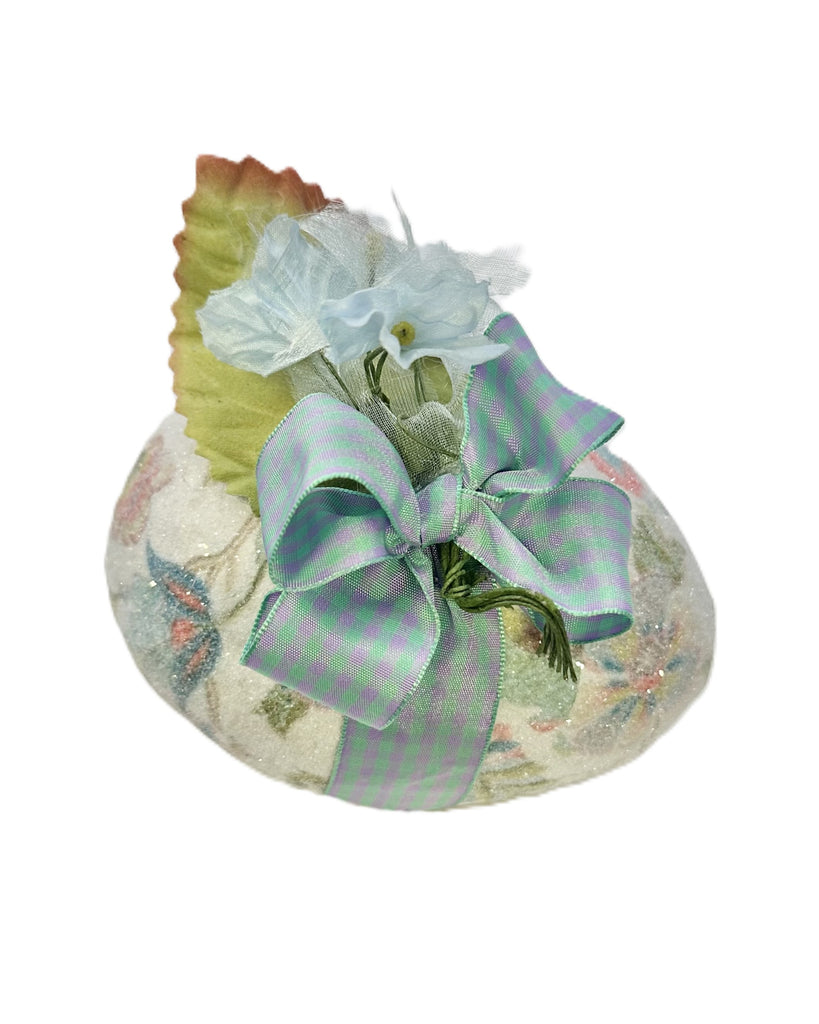An egg with an old soul and excellent taste. This decoupaged beauty shimmers in a soft Jacobean Floral motif, finished with authentic vintage ribbon and delicate vintage flowers—that look like they’ve already lived a good life and have stories to tell. It's equal parts charm and precious heirloom.