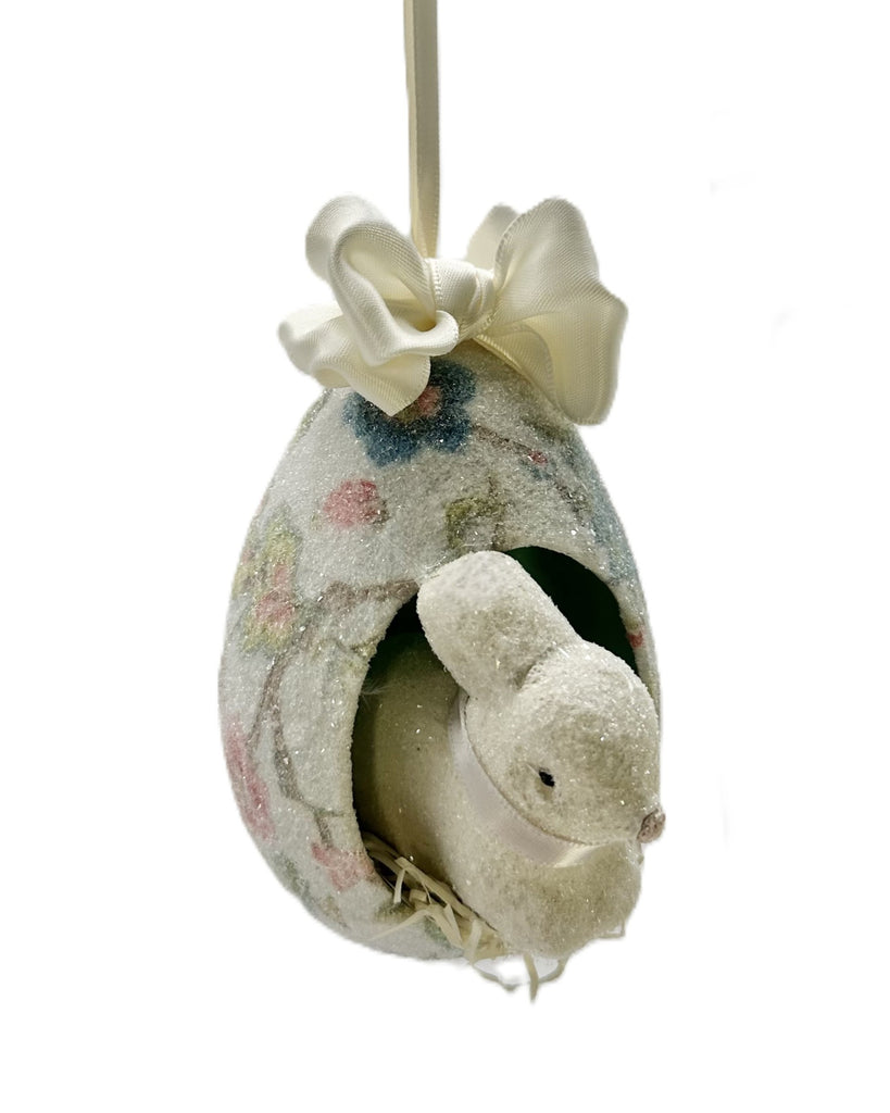 Our “Peek-A-Boo” Egg Ornament is delicately decoupaged in a Jacobean floral print, sparkles with glass glitter, and is topped with a satin bow. Inside, an adorable white bunny nests on shredded-paper grass. It comes ready to hang with a luxe satin ribbon. The eggs-traordinary pop your Easter decor never knew it needed!