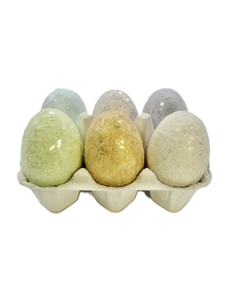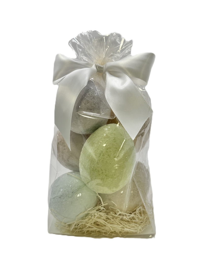 Six medium-sized eggs, delicately decoupaged and gathered like they planned this all along. Tucked into a pretty cello bag and finished with a crisp white satin ribbon, this little lineup brings instant charm—no styling required, just add spring.
