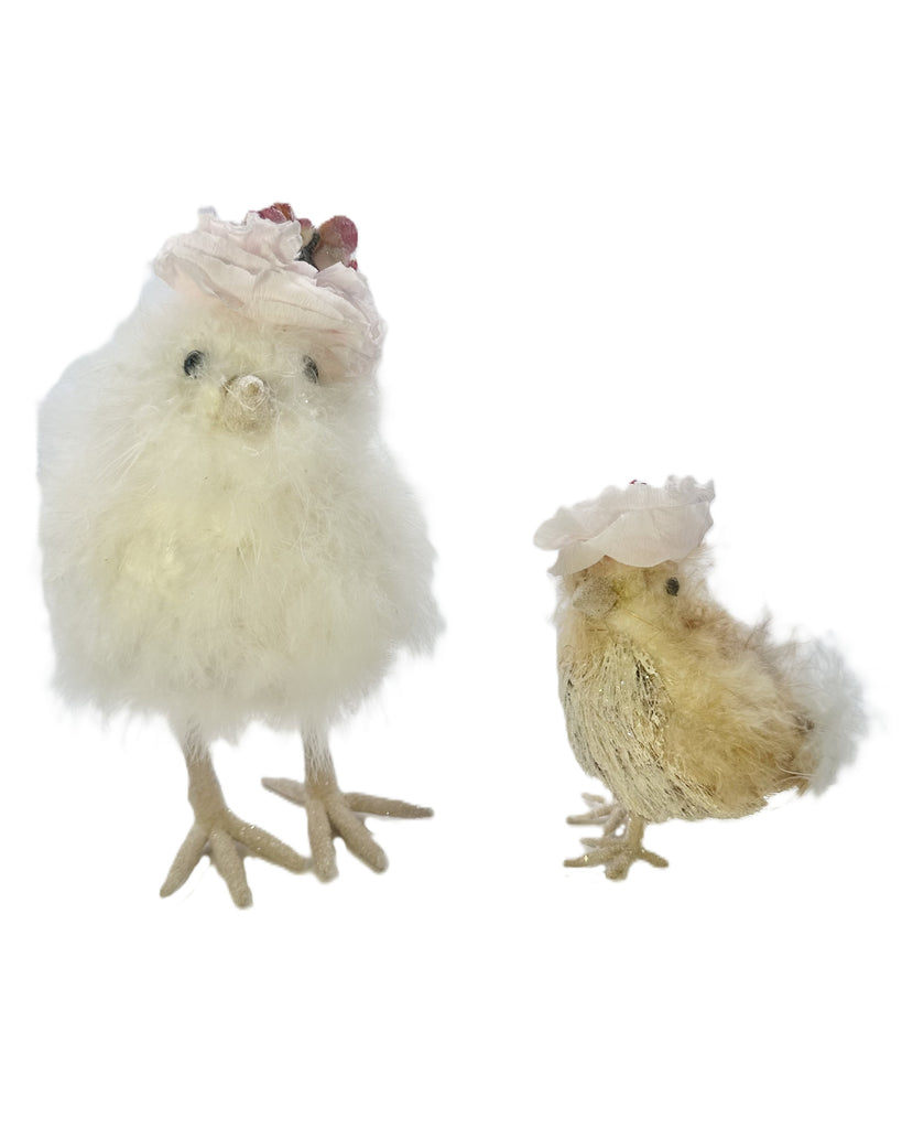 This fluffy chick is bursting with charm and Easter style. Its glittering glass-glittered beak and feet shimmer with elegance, while a blush-colored crepe with a pink flower hat sprinkled with sparkling glass glitter, brings a fresh pop of springtime. The perfect addition to your Easter décor collection!