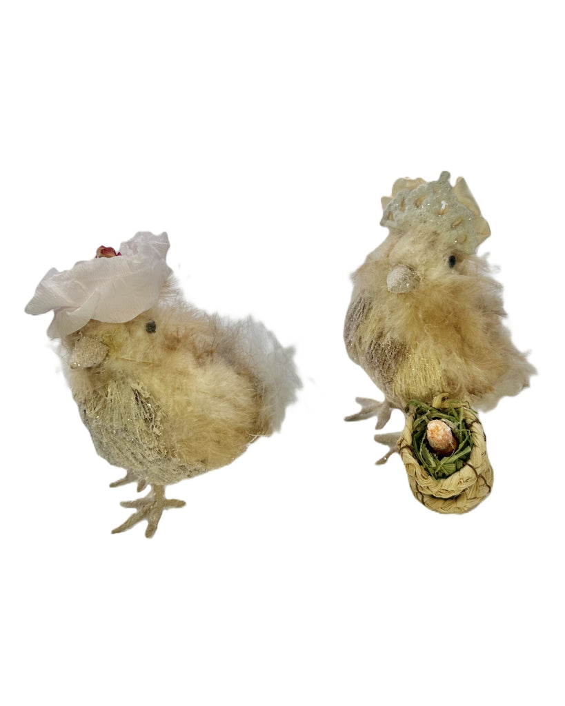 Shown Left: Meet our sassy hen. She’s not just clucking around—she’s strutting, dusted head to tail in light-catching glass glitter. Naturally, she tops it all off with a pink crepe-paper hat, crowned by a shimmering vintage rose. Attitude included. .