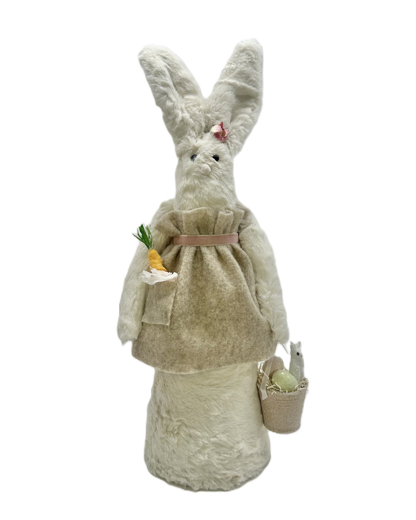 Meet Liza Rabbit: bisque-hued faux fur, clear-eyed confidence, and a button nose that absolutely means business. She’s dressed in a plush faux-fur apron with a carrot tucked neatly in the pocket, finished with a rose-velvet band that tips its hat to the tiny flower behind her ear. In one hand, Liza carries a shimmering bucket—inside, a petite sparkling bunny nestled among glimmering eggs. Equal parts charm and whimsy.
