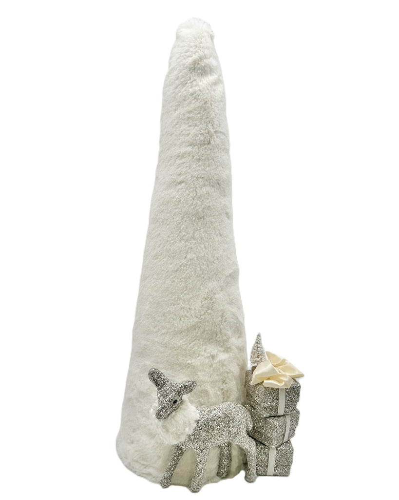 Our cone-shaped tree flaunts a cloud-soft ivory faux fur coat that begs for a gentle squeeze, while a tiny, twinkling deer—dusted head to hoof in German silver glass glitter—prances amid a cluster of holiday packages, each one vying for the spotlight in this playful, merry tableau.