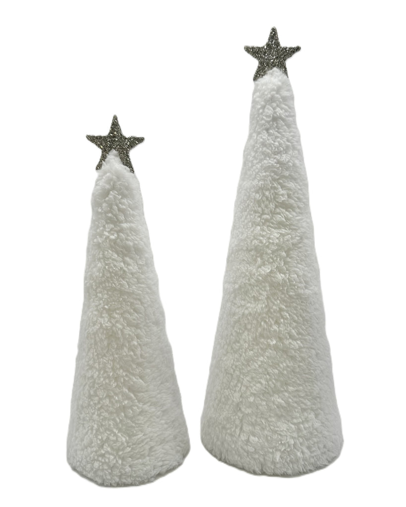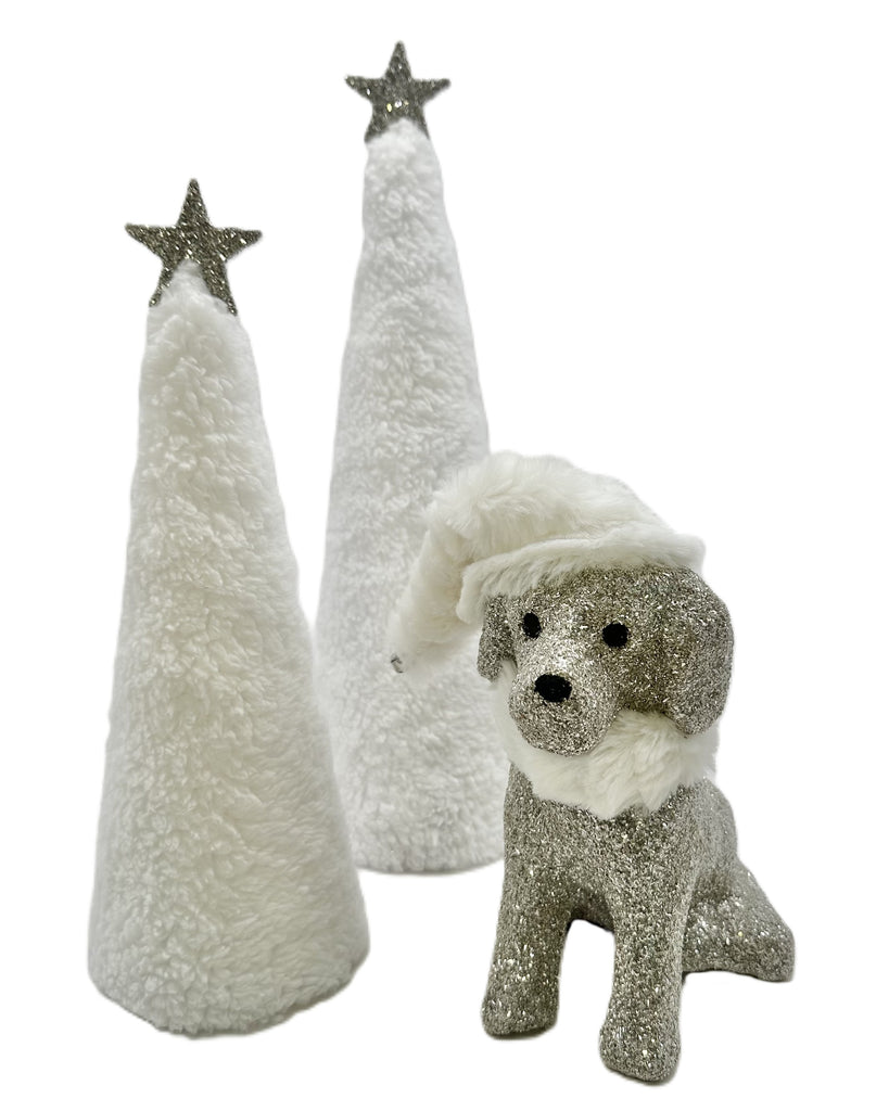Shown Left: Our fabulous small cone-shaped tree is wrapped in cloud-soft faux Sherpa fur and crowned with a star dusted in German silver glass glitter. It’s a wonderful solo, but even better when paired with our medium star tree for a styled, layered moment that says “effortless holiday magic” without trying too hard.